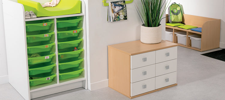 - úložný nábytek s policemi, dvířky nebo zásuvkami, nábytek s přihrádkami na hry, aktivity vybavení