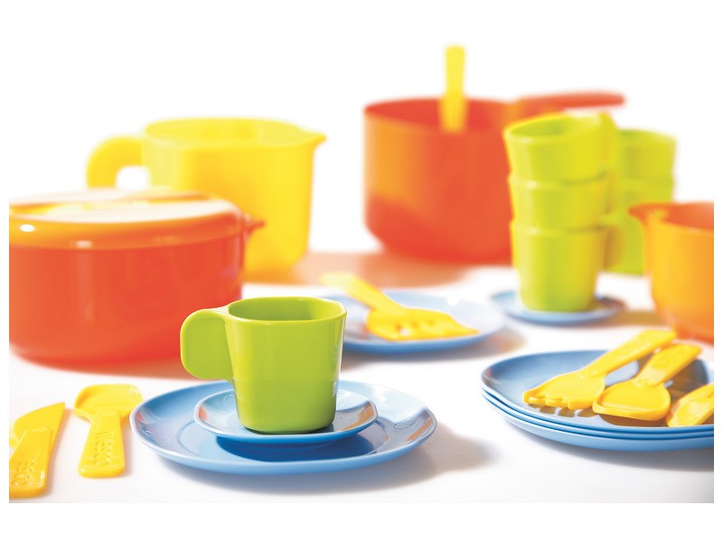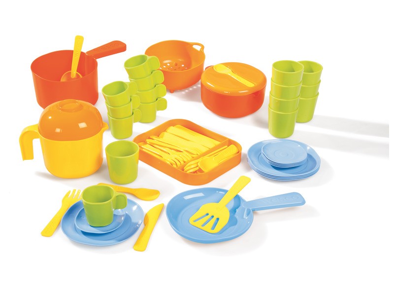 Složení: 8 šálků, 8 talířů, 8 talířů, 8 vidliček, 8 nožů, 8 lžiček, 4 sklenice, 1 čajník, 1 pánev, 1 cedník, 1 pánev, 1 špachtle, 1 naběračka, 1 krabice a její víko a 1 krabice skladování.