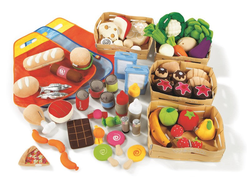 Kompletní sortiment textilních potravin pro hraní na trhu: ovoce, zelenina, ryby, maso, mléčné výrobky ...