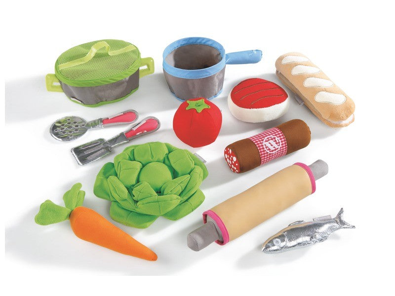 Obsahuje: 1 hrnec, 1 pánev, 1 váleček, 1 podběrák, 1 špachtle, 1 rajče, 1 hlávkový salát, 1 mrkev, 1 sardinka, 1 bageta, 1 klobása a 1 sýr. Vyrobeno z RŮZNÝCH TKANIN. Dá se prát při 30°C.