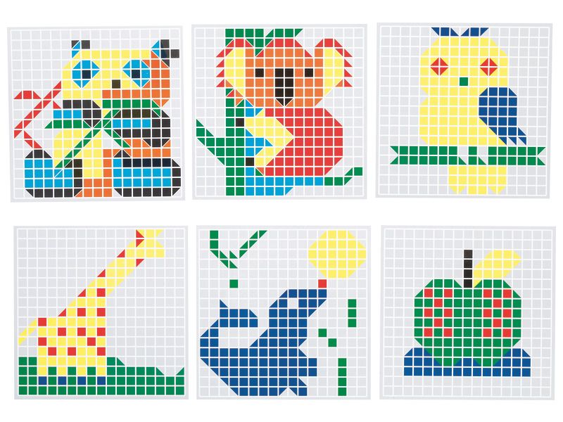 mozaika tvořená vícebarevnými čtvercovými nebo trojúhelníkovými dílky, které mají být nahrazeny mřížkou.