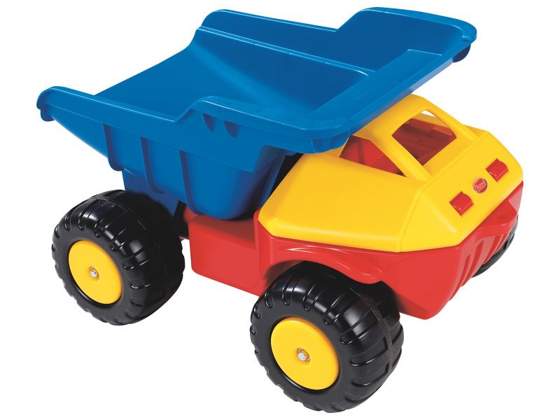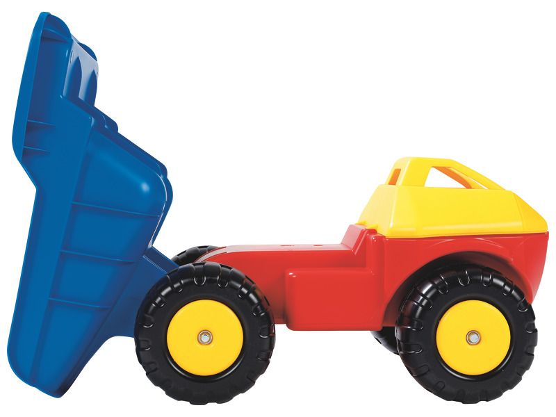 Robustní a jasně zbarvený tento obří nákladní vůz unese objemné náklady. Kbelík se může naklonit, aby vysypal jeho obsah.