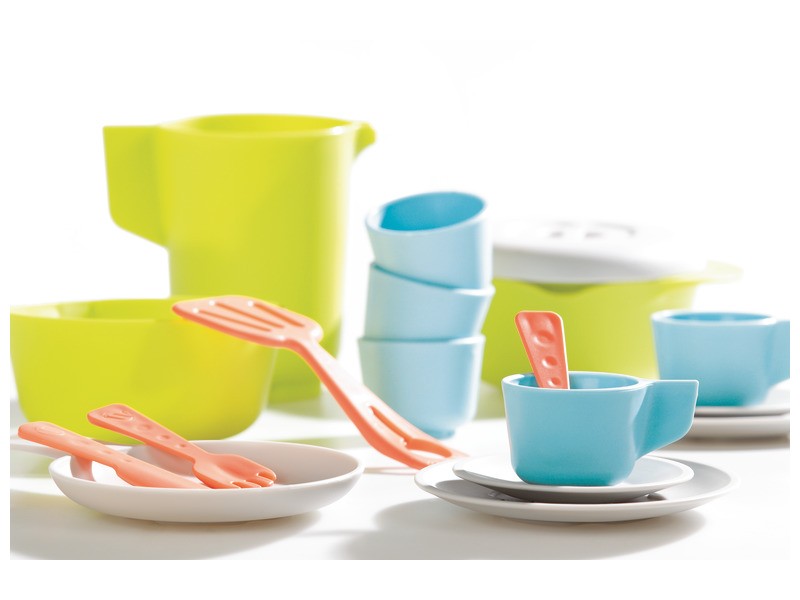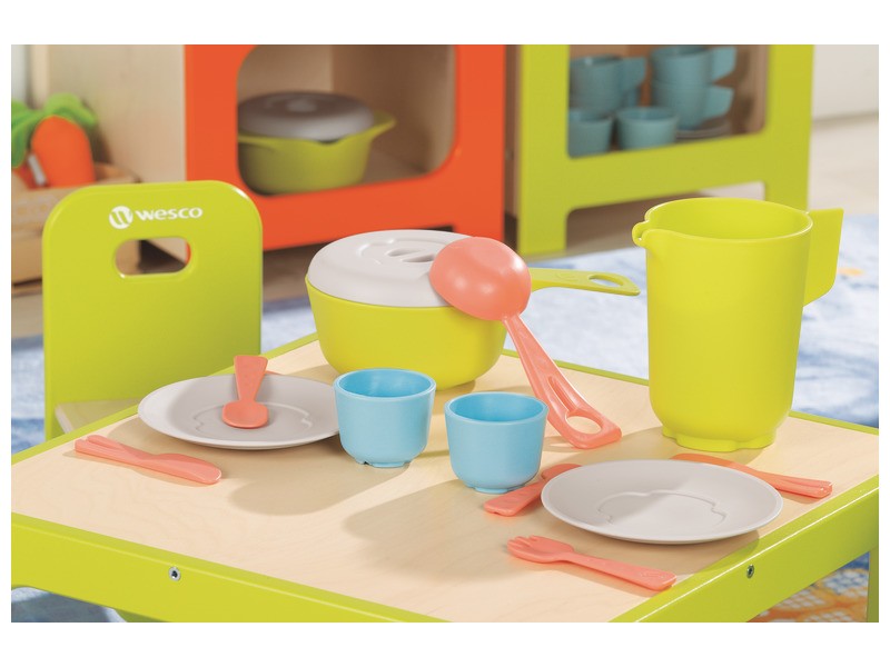 Tato jídelna vyrobená ze 100% recyklovatelného plastu s jemnými barvami, estetickým a čistým povrchem, stimuluje představivost dětí a prostřednictvím imitace hry rozvíjí slovní zásobu, výměnu a učení pravidla komunitního života.
