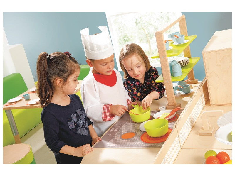 Tato jídelna vyrobená ze 100% recyklovatelného plastu s jemnými barvami, úhlednou estetikou a povrchovou úpravou, stimuluje představivost dětí a prostřednictvím imitace rozvíjí slovní zásobu, výměnu a učení. pravidla komunitního života.