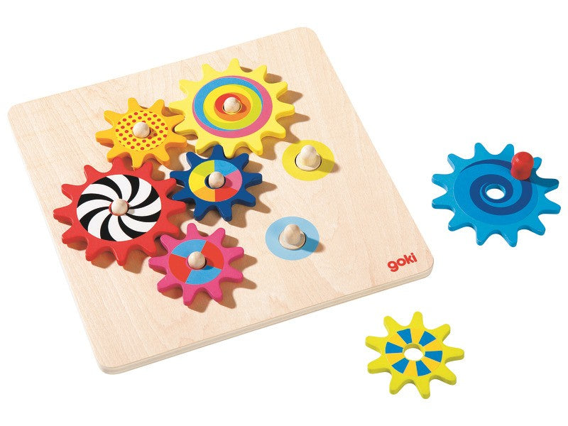 Děti umístí dřevěná kolečka na desku. Velké modré kolo se používá k aktivaci mechanismu: otáčí se všechna kola najednou? Zábavná a kreativní hra s pěknými barvami.