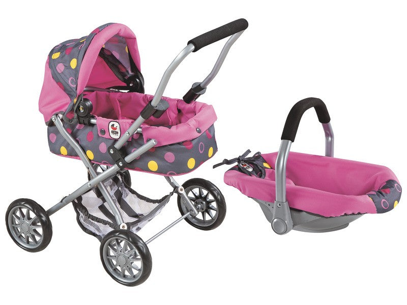 Skládací kočárek pro panenky má skládací kapuci, úložný koš, opláštěnou rukojeť a tichá kola EVA. Kočárek je vhodný pro panenky do 38 cm a cosi je vhodný pro panenky do 50 cm.