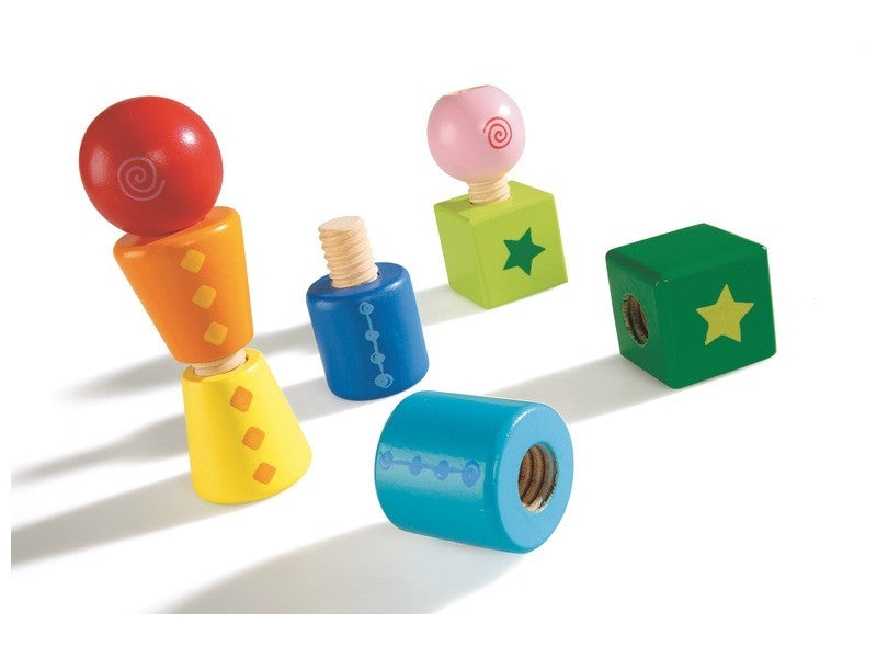 Složení výrobku: 8 dílů různých tvarů (kostky 2, 2 válce, kužely 2 a 2 koule), které mají být smontovány.